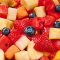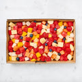 A vibrant fruit platter brimming with an assortment of freshly sliced seasonal fruits, perfect for sharing among 10 guests. VG
