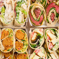 An assortment of wraps, each filled with savoury ingredients, fresh vegetables, and creamy spreads. This platter includes: Steak and Chimichurri, Falafel and Sriracha, Chicken Caesar and Halloumi Greek salad.