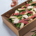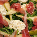 A delicate salad of sweet, ripe pear and savoury Parma ham, served on a bed of fresh baby leaves — a perfect balance of salty and sweet, finished with a light dressing for a refined, refreshing bite.